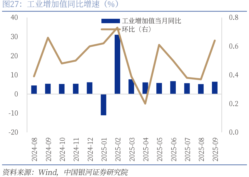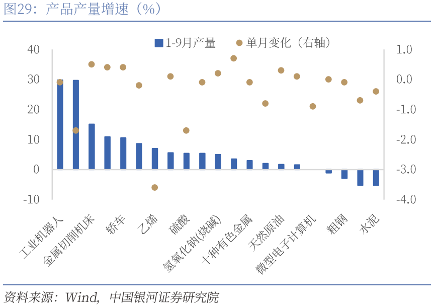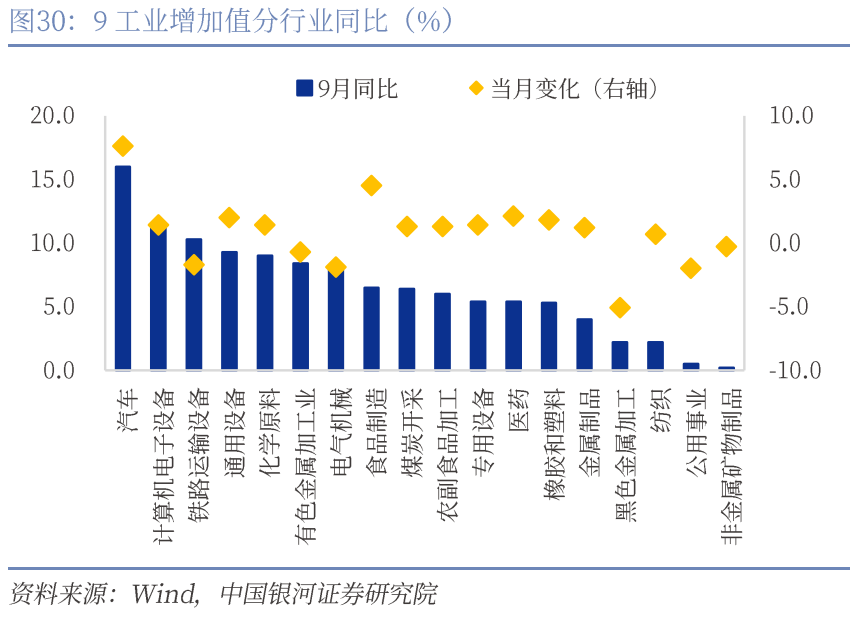 三是 “两新”计策诚然仍在证实后果,“两新”“两重”等扩内需计策效应握续向坐褥端传导,带动了开采制造、奢侈品制造谋划行业和产品坐褥,更推动了智能智造、绿色制造、数字时代等鸿沟的坐褥延长与时代迭代,为产业结构优化、新旧动能相易按下了“快进键”。9月汽车、电子信息、通用开采增速分离加多7.6pct、1.4pct和2pct至16%、11%和9.3%;前三季度限度以上锂离子电板制造、船舶及谋划安装制造、电机制造等行业加多值同比分离增长29.8%、22.9%、17.1%。分产品看,3D打印开采、工业机器东说念主、新能源汽车产品产量同比分离增长40.5%、29.8%、29.7%。
