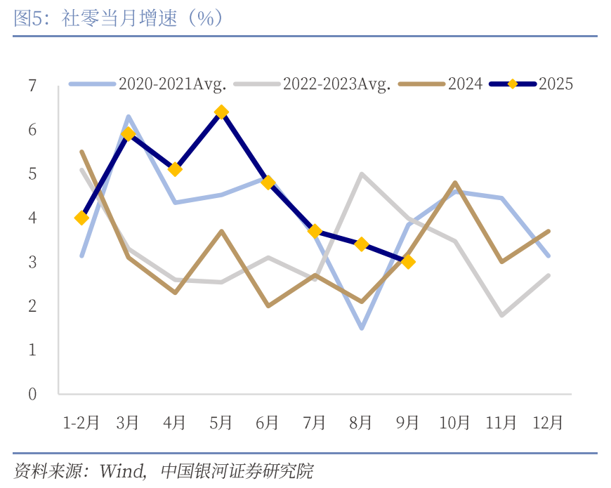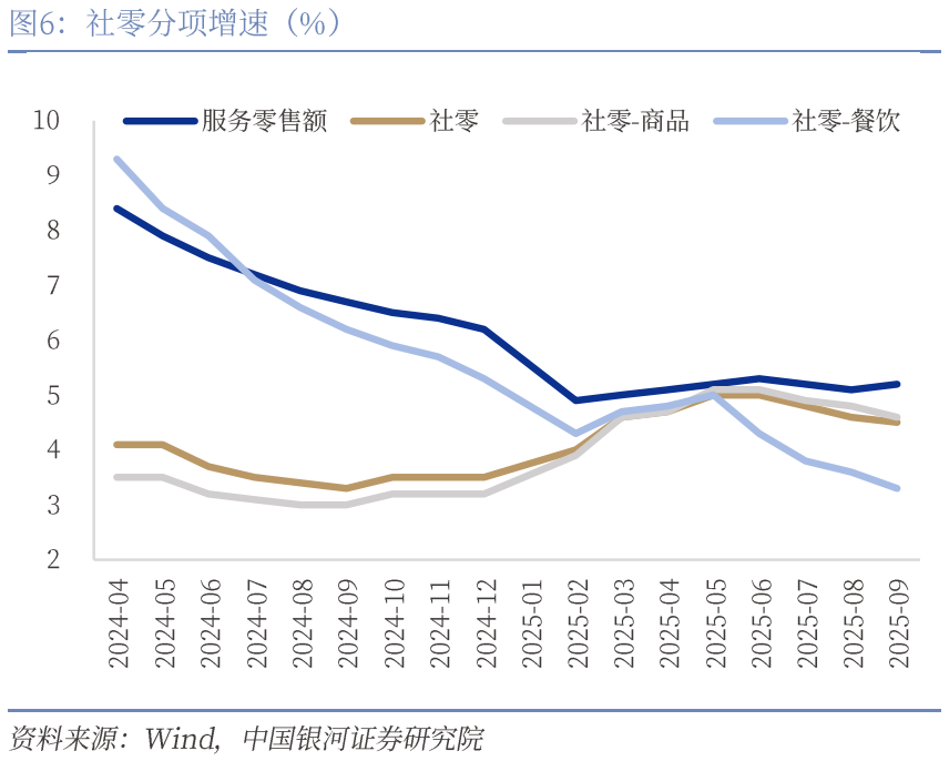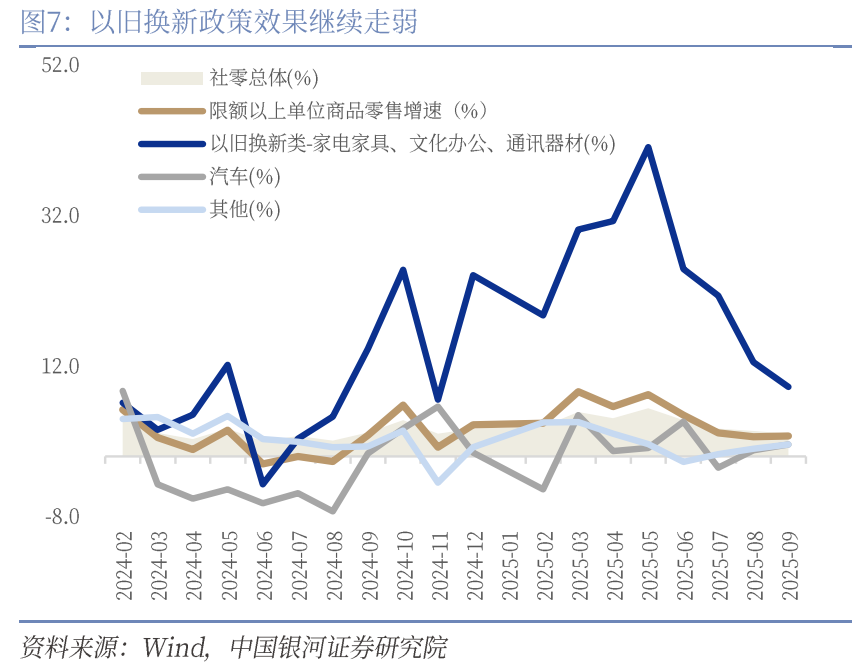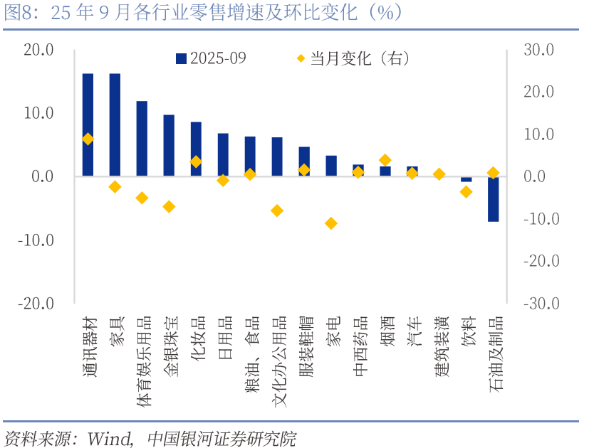 商品零卖延续结构性分化,改善型奢侈看护一定景气度。9月零卖增速最高的分离是通信器材(16.2%)、产品(16.2%)、体育文娱用品(11.9%)、金银珠宝(9.7%),通信器材受益于AI手机换代预期;产品类则在家装需求开释的推动及昨年低基数影响下达成同比高增;体育文娱用品看护两位数增长,住户健康奢侈趋势延续,户外绽放装备、健身类产品需求握续升温;金银珠宝则受益于金价高涨、昨年低基数等成分。与之相对的是,家电类零卖增速仅为3.3%,较上月大幅回落11.0个百分点;文化办公用品类同比仅增6.2%,较上月亦显赫下滑8.0个百分点,以旧换新计策的前期透支效应骄气。此外,建材、汽车等可选奢侈品类看护低速增长或小幅下滑,反应出举座奢侈动能仍处于弱开发阶段。