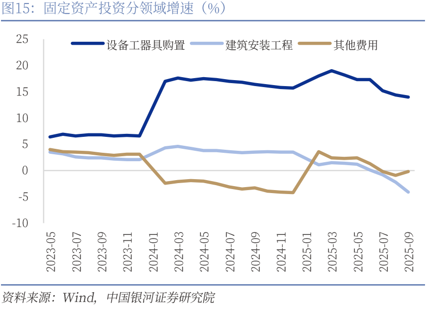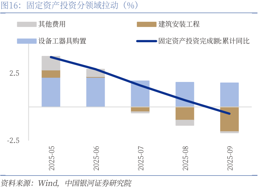 制造业投资在高基数下渐渐走弱,开采更新边缘递减和反内卷是主因。制造业看成我国经济的压舱石,2024年全年在稳增长和开采更新计策的双重支握下促进投资保握较高增速,制造业投资在2024年全年保握9%以上。但来到2025年下半年,一是开采跟新计策濒临边缘效应递减,企业的开采和可更新开采是有上限的;二是“反内卷”倡议或还是影响企业投资有狡计,因为制造业投资影响的是企业畴昔的产能,而要是企业对畴昔预期不清静,或是由于计策等信号让企业对投资保握不雅望魄力,就会减少投资扩产。这点咱们不错在建筑安装工程神态投资增速从6月大幅下滑,7月转负获取印证,6月底汽车行业打响了本轮反内卷的第一枪。
