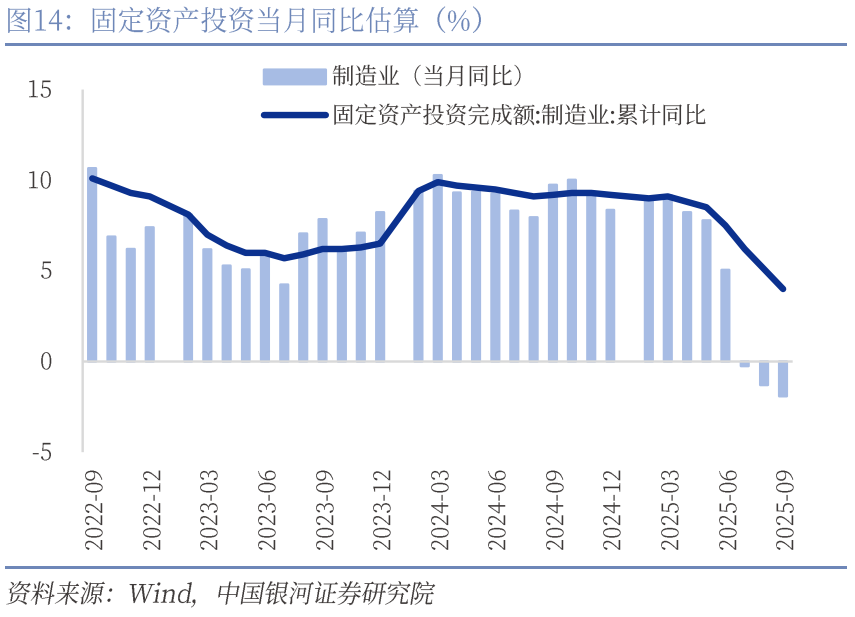 制造业投资下滑较大。1-9月制造业投资边缘下滑1.1pct至4%,制造业投资聚积6个月下滑,且聚积4个月下滑大于1pct,咱们测算9月制造业投资当月同比或为-1.92%。分鸿沟来看,开采更新成为拉动固定资产投资正增长的独一神态,建筑安装工程和其他用度均保握为负增。1-9月开采工器具购置投资增速为14%(前值14.4%);而建筑安装工程和其他用度录得-4.1%和-0.2%(前值-2.2%和-0.9%)。