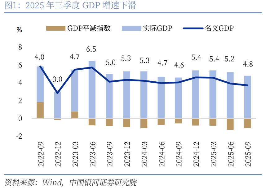 2025年三季度我国GDP增长络续回落,GDP增速略低于宗旨值,相宜市集预期。三季度GDP总量达到354,500亿元,GDP增速4.8%,与预期一致,比一季度增速有所减缓。GDP形态增速3.7%,比二季度下滑0.2%。三季度GDP环比增速1.1%,保握妥当。