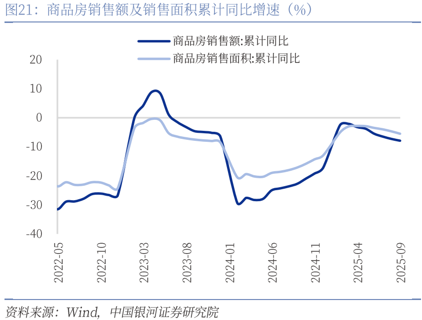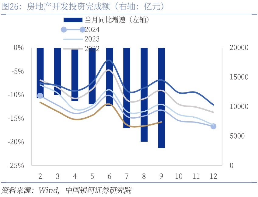 成就端极点天气影响施工络续走弱,新开工和完满负增长有所回升。1—9月份,房地产开发企业房屋施工面积648580万平方米,同比下落9.4%(前值-9.3%)。房屋新开工面积45399万平方米,下落18.9%(前值-19.5%)。房屋完满面积31129万平方米,下落15.3%(前值-17%)。9月寰球出现极点征象仍然较多,高温、多雨、台风影响户外开工。9月以来3个台风登陆我国,寰球平均降水量80.1毫米,较长年同期偏多32.4%,为1961年以来历史同期第四多,寰球平均气温18.2℃,较长年同期偏高1.0℃,为1961年以来历史同期第四高。