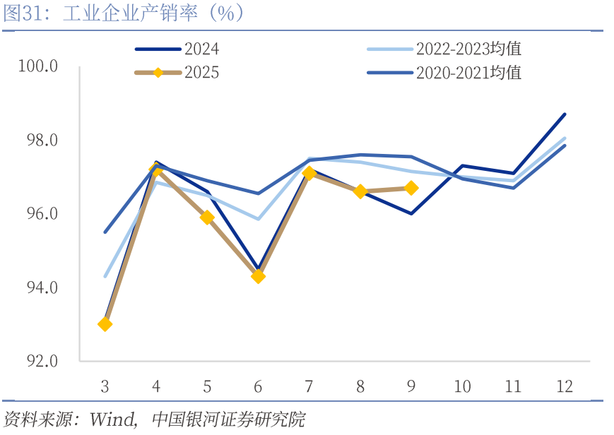 产销同比回暖,但距离历史均值还有差距。9月产销率为96.7%,环比上升0.1pct,同比提高0.7pct。产销率9月上行不异反应了出口端需求的加多以及内需的复苏。不外距离历史均值97.4%还有一定差距,需求端仍还有提高空间。从产能应用率来看,煤炭开采(68.9%)、非金属矿物(62%)、玄色金属冶真金不怕火(80.1%)、专用开采(75.5%)、纺织业(77.2%)和医药(71.9%)环比下滑;通用开采(78.9%)、电气机械(74.9%)、电子信息(79%)、汽车(73.3%)以及食物制造(70.1%)环比上行。