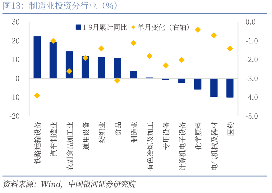 分行业来看,开采更新和产业升级是拉动制造业投资的主力。前三季度开采工器具购置投资同比增长14.0%,拉动沿途投资增长2.0个百分点,握续保握两位数增长,是拉动投资的繁多支点。与开采更新谋划的狡计机及办公开采制造业、通用开采制造业、铁路船舶航空航天和其他运输开采制造业投资分离增长7.4%、11.8%、22.3%。汽车制造业投资增速累计同比19.2%,依然保握较高增速但下落1pct,汽车行业诚然在推动反内卷,不外主要聚焦于销售和付款上,新能源转型依然让汽车行业投资保握高增。不出门口产业链投资下落驱动骄气,电子信息、电器机械以及医药制造投资前三季度投资累计分离-2.1%、-9.5%和-9.9%,其中电子信息本月降幅达到2pct。