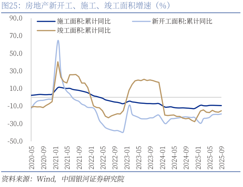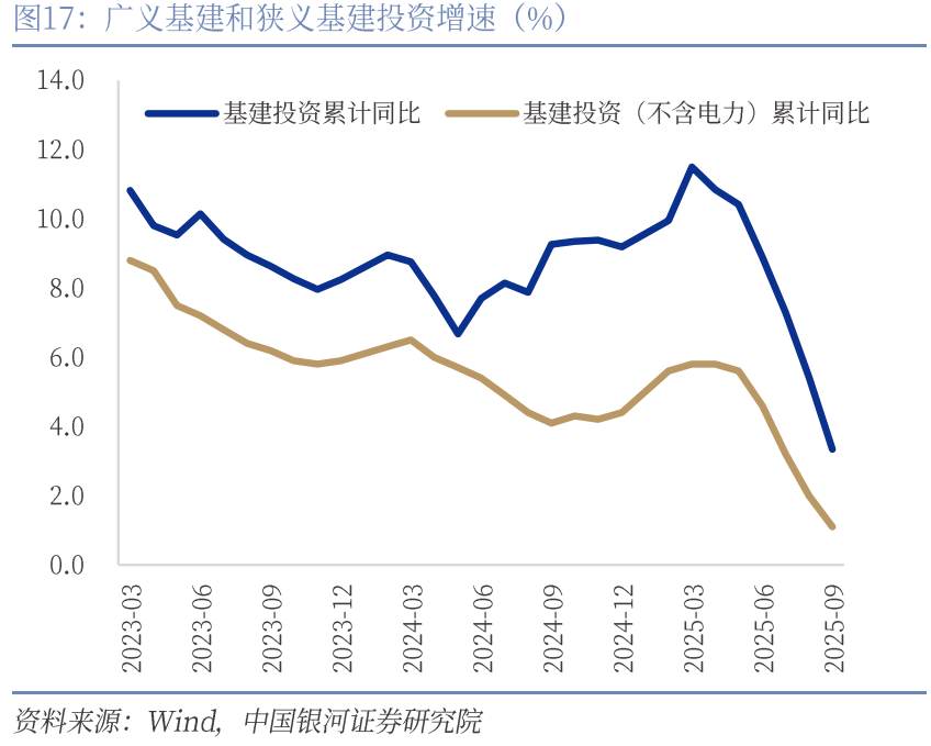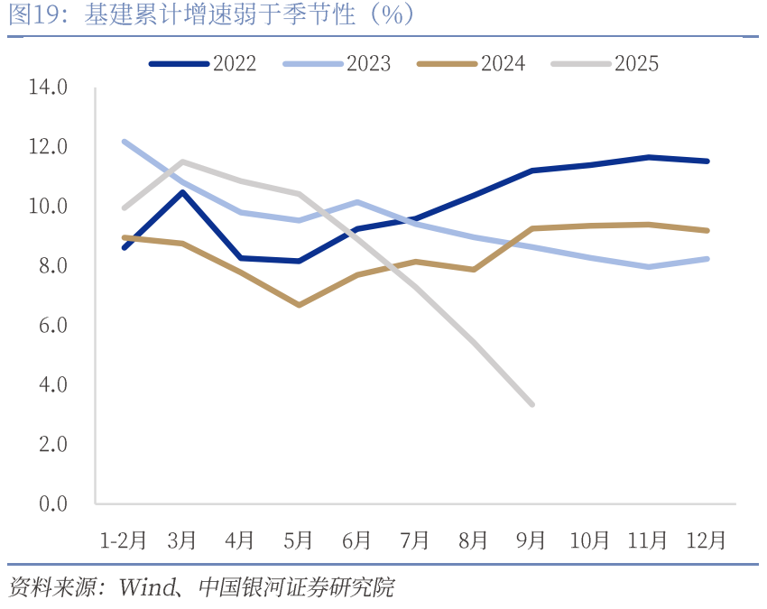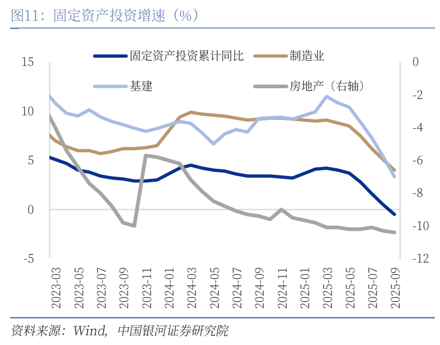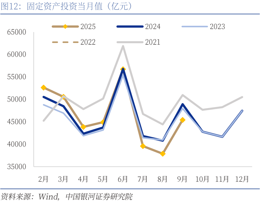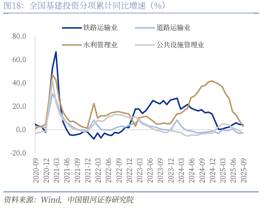 基建投资延续下行趋势。1-9月狭义基建投资累计增速1.1%,较上月回落0.9个百分点。估算当月基建投资增速-4.7%(前值-5.9%),显赫低于季节性。其中水利处理业、铁路运输业、各人要领处理业增速分离较前值降4.4、0.3、1.7个百分点,说念路运输业跌势企稳但仍为负增长。9月建筑业PMI仍在非景气区间。资金端来看,近期中央对地点财力的补充有望对四季度投资增速酿成一定救助。1-9月政府债累计融资11.4万亿元,较昨年同期多增约4.3万亿元,但在化债压力下地点政府关于新增神态大量保握严慎。近期中央财政从地点政府债务结存名额中安排5000亿元下达地点,这次周转地点债务名额使用范围也有所拓展,除用于补充地点政府轮廓财力,还安排额度用于经济大省相宜条目的神态成就,精确支握扩大有用投资,更好证实经济大省挑大梁作用,同期,财政部明确本年将络续提前下达2026年新增地点政府债务名额,后续专项债刊行节律有望开发,年中以来加速回落的投资增速有望迎来资金救助。